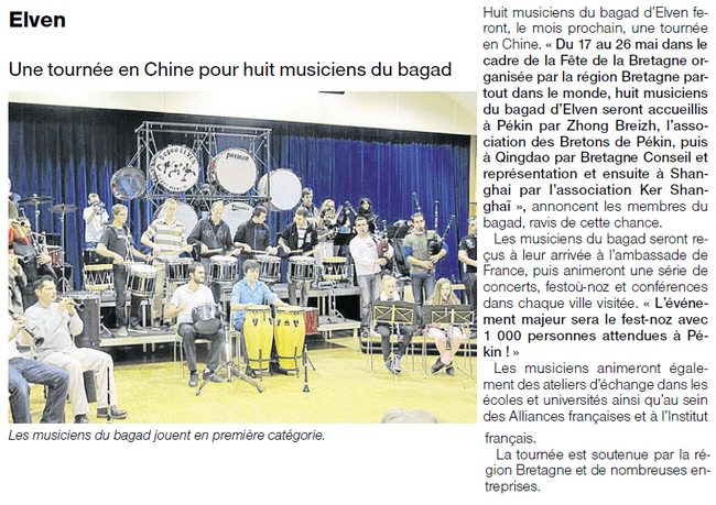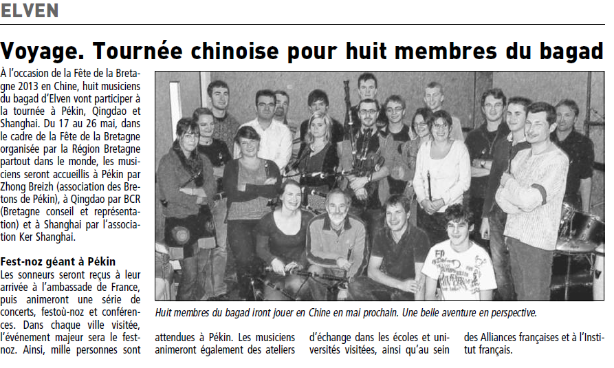 Juste après l'Allemagne, à l'occasion de la Fête de la Bretagne 2013 en Chine, huit représentants du Bagad Elven partent en tournée à Pékin, Qingdao et Shanghai.